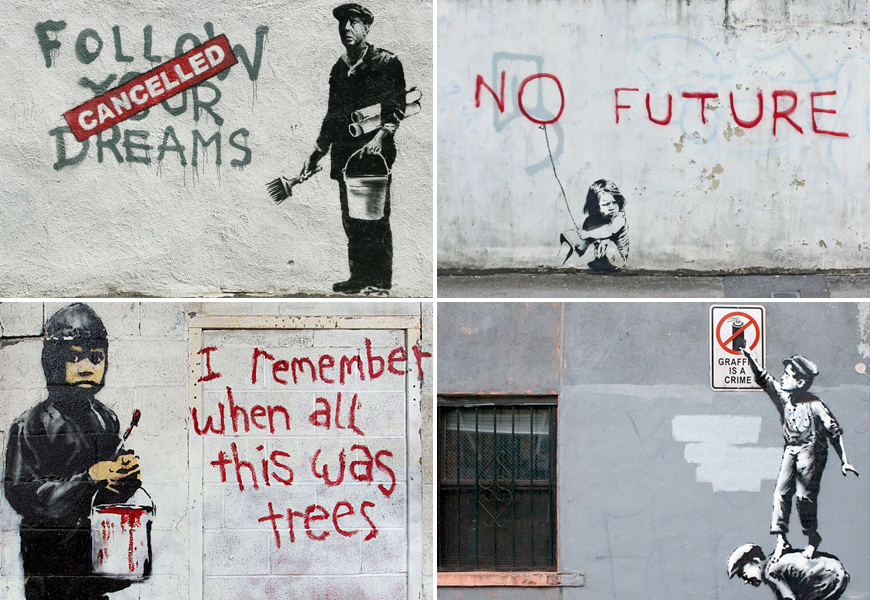 His satirical street art and subversive epigrams combine dark humour with graffiti executed in a distinctive stenciling technique.